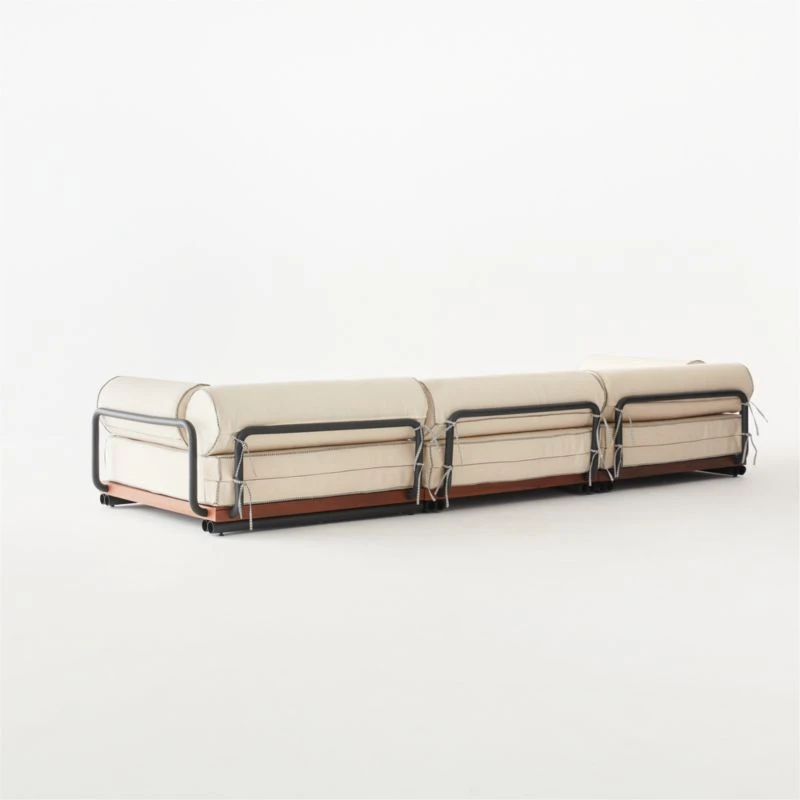 Matte black aluminum pipe frame, midtone mahogany platform and cushions for days. Brett Beldock’s low-profile 3-piece sofa is made for lounging around. Chic down to the details with black and white striped piping and round back pillows. We’re in love. Learn more about Brett Beldock on our blog. CB2 exclusive.