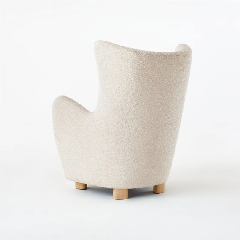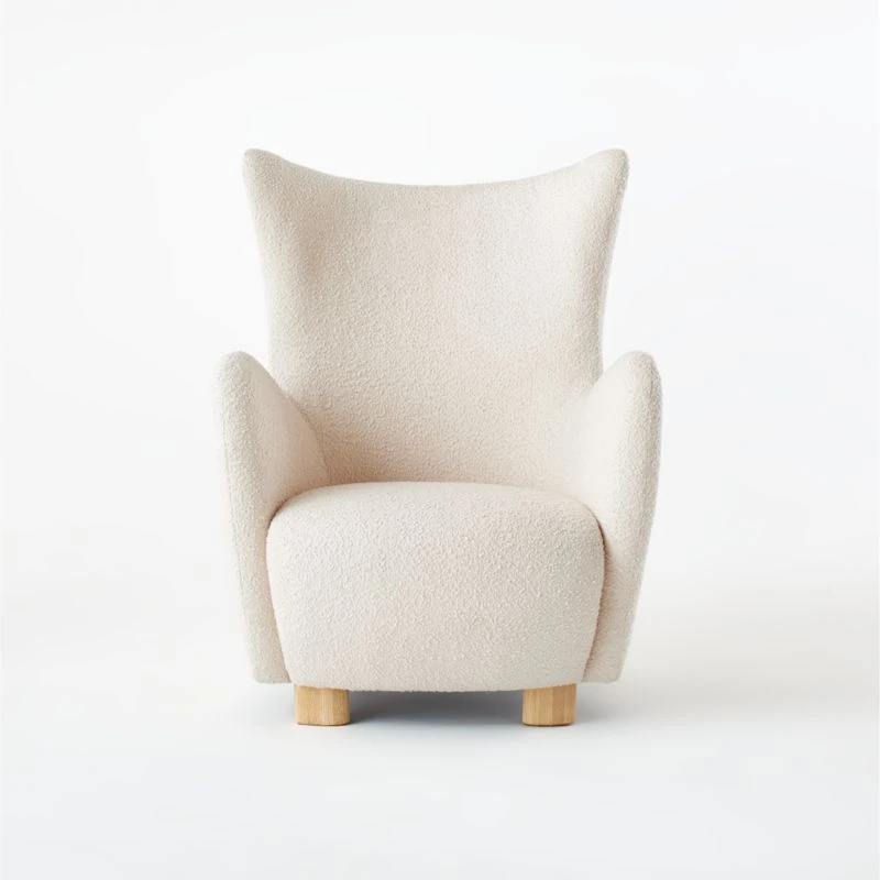 A modern take on a classic wing chair. Designer Ross Cassidy brings his signature flair to a popular silhouette by wrapping it entirely in luxe ivory boucle. Bleached oak feet are asymmetrical and wire-brushed for a special design detail, with matching asymmetrical ottoman. Framed out in FSC ®-certified wood. CB2 exclusive.