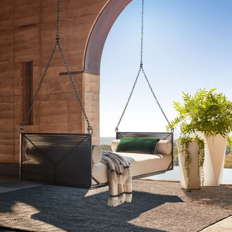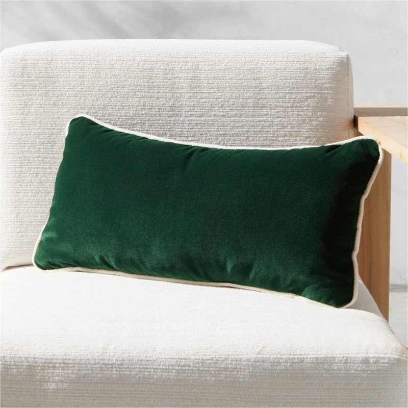 Deep forest green velvet pillow brings the rich texture and appeal of indoor textiles to the outdoors. Innovative recycled velvet certified to the Global Recycled Standard (GRS) is soft to the touch and durable against the elements. Contrasting white piping lends an elevated finish. CB2 exclusive.