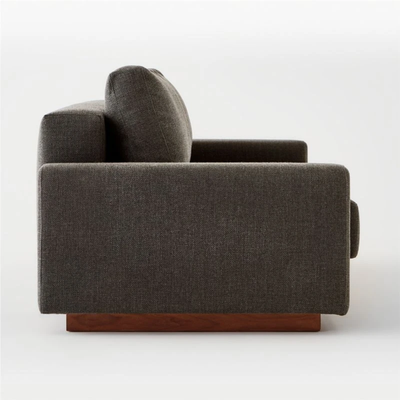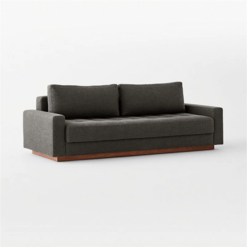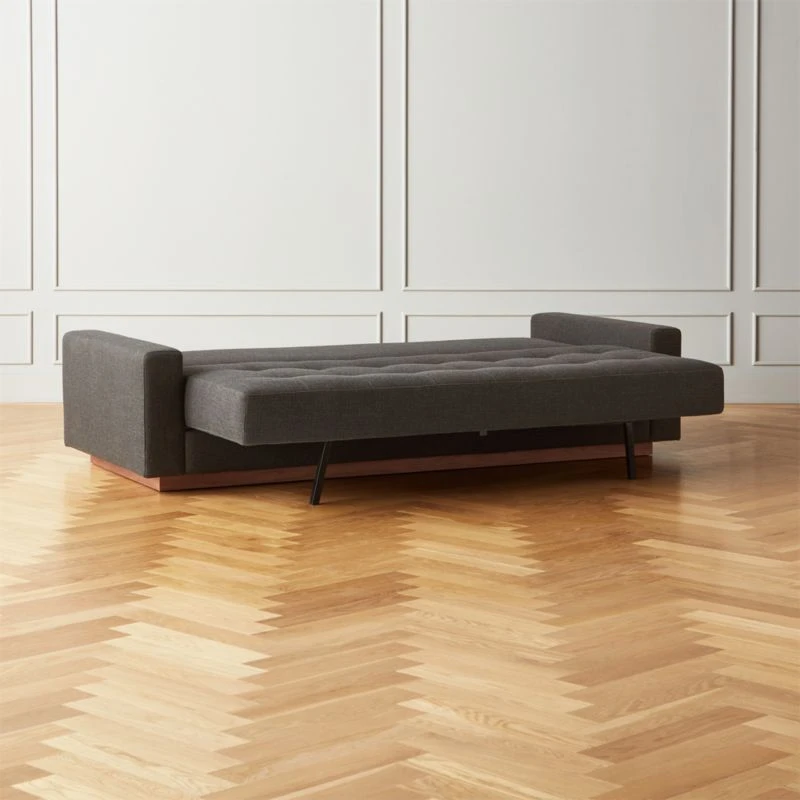 Tailored sofa in charcoal grey menswear-inspired fabric goes from day to night seamlessly. Remove the back cushions, pull up the seat and extend front legs from hidden zipper pockets underneath. Slide the seat forward and fold the back down. No need to pull away from the wall or unfold a heavy mattress. Neat feature: Full-length arms become the headboard and footboard. Sofa sleeps two comfortably. CB2 exclusive.