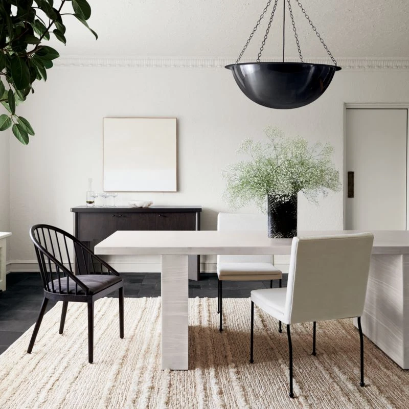 “We used marbleized resin in our last collection, but this time we’re doing it in a totally different way,” says designer Kara Mann of this oversized dining table. Solid resin with gorgeous white marbleized tones spans 100 inches to seat up to eight comfortably. CB2 exclusive.