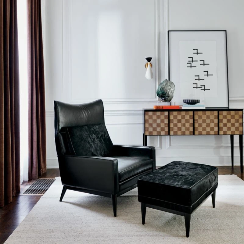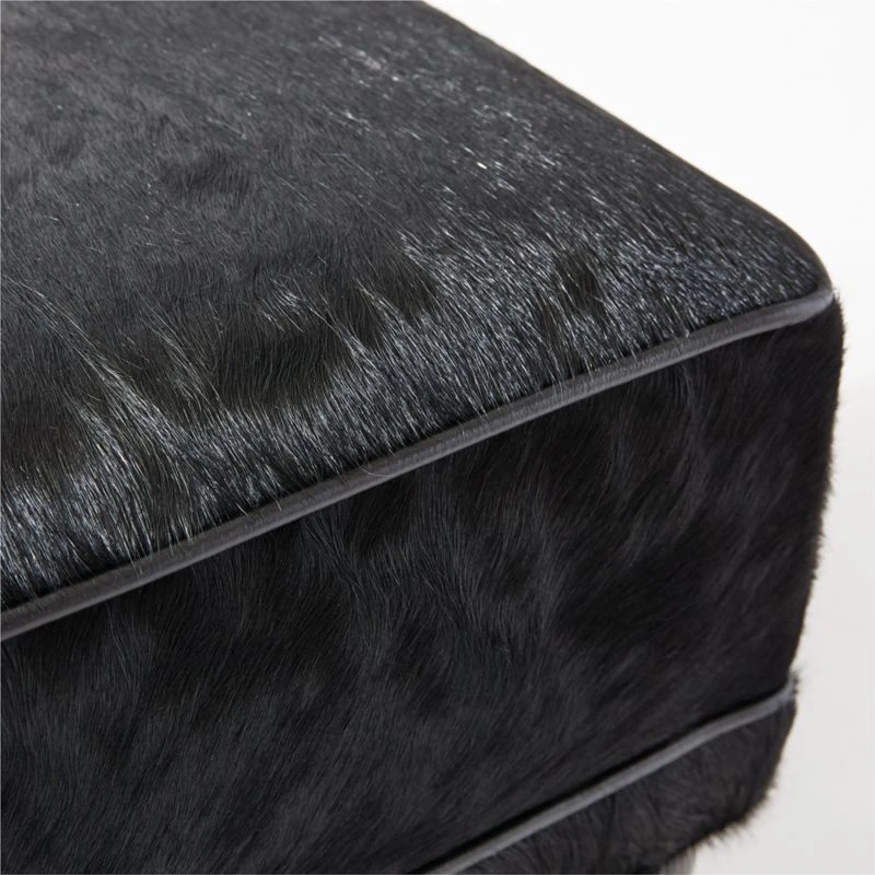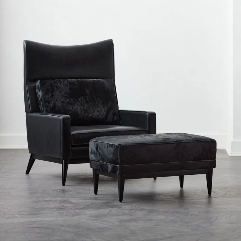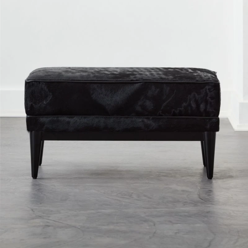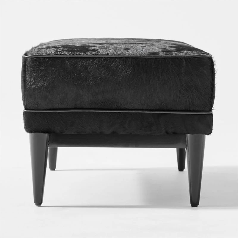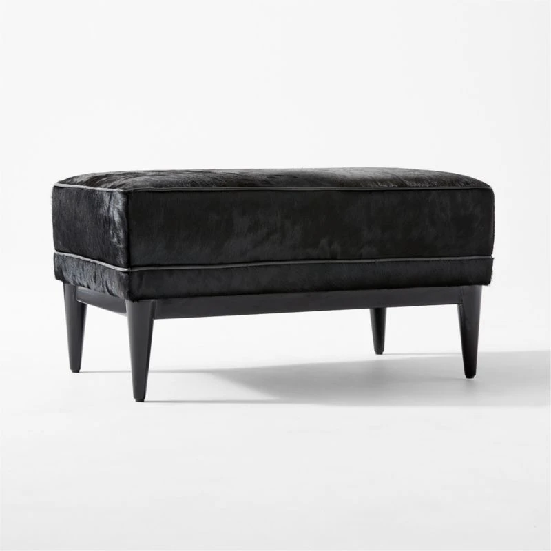 Classic ottoman by Paul McCobb is crafted of black hair on hide with a black leather welt—sort of a reverse matching of the coordinating Embassy Leather Lounge Chair that makes it design-forward and interesting while remaining true to its midcentury roots and craftsmanship. Also stunning on its own. CB2 exclusive.
