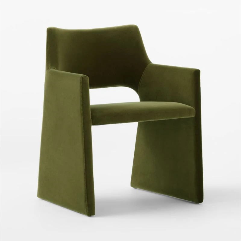 Luxe velvet in deep olive green is framed up in an architecture-inspired dining chair worthy of a Parisian loft. Designed by Caleb Zipperer, arms and legs flow together as one, giving base to a super-plush seat deep enough to pass as a comfy accent chair. CB2 exclusive.