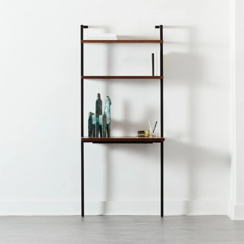 Party on top, business on the bottom. Three fixed walnut veneer shelves ladder up alongside a powdercoated metal frame and pull double duty as a display/work space. Modularly designed to save room and stand next to our matching Helix walnut bookcase. Stud mounting recommended; hardware included for drywall installation. CB2 exclusive.