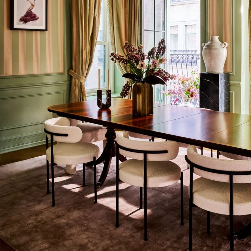 Steel tube with matte black finish frames a modern, Italian-made dining chair. Textural ivory boucle wraps the curved back and round seat in luxe contrast. CB2 exclusive.