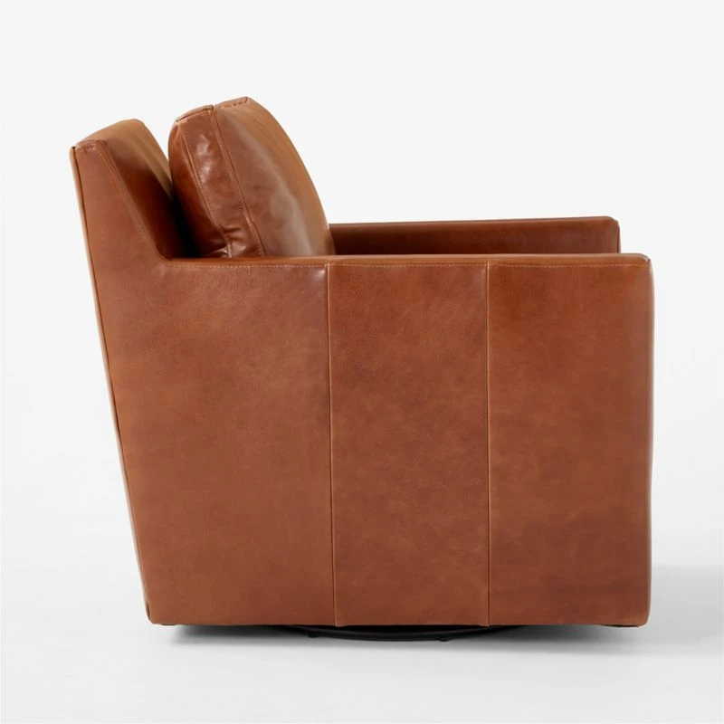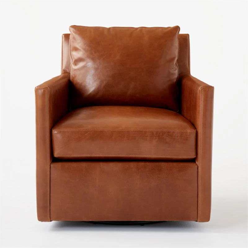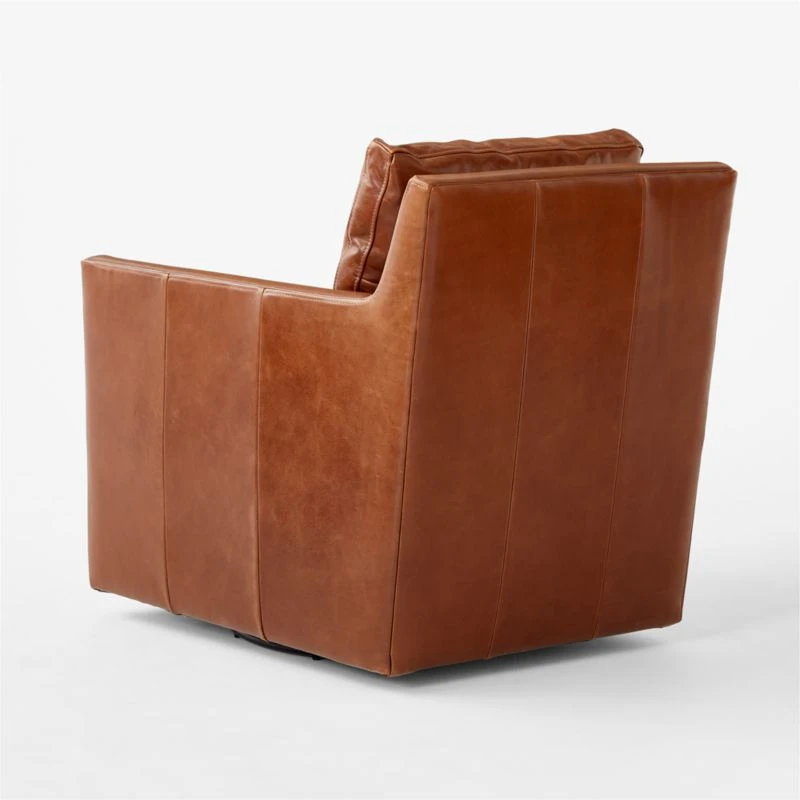 Set atop a swivel base, brown leather chair is a modern update on a classic style. Slim track arms and neat topstitching form a sleek silhouette, while a super-soft detached cushion invites lounging. Tailored in Moore & Giles leather, swivel chair will develop a rich patina over time. CB2 exclusive.