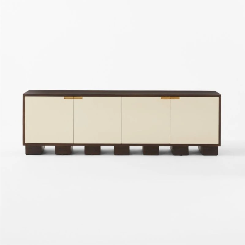 Inspired by Brutalist architecture, media cabinet by Barcelona design house Mermelada Estudio has minimalist construction details and chunky, repetitive block legs. Creamy, high-gloss enamel doors are adorned with a soft, subtle waviness that beautifully reflects light and contrasts with the chocolate-stained, wire-brushed mango wood case. Integrated cutout handles, crafted from unlacquered brass, will develop a unique patina that will vary in color and darken over time. CB2 exclusive.