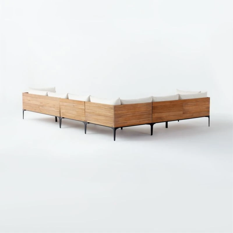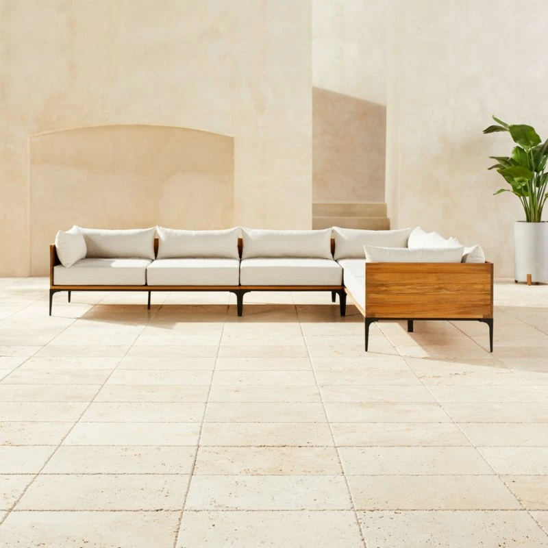 Sophisticated outdoor sectional from Barcelona-based Mermelada Estudio blends certified sustainable teak wood with durable cast metal legs and nubby textured upholstery. A chic mix of materials that takes outdoor furniture to a new level. Soft white cushions feature Sunbrella® performance fabric known for its durability, comfort, ease of cleaning and color stability. The teak wood varies in tone from blonde to amber. When left uncovered, the sectional will patina to a beautiful silvery-grey. Learn about Mermelada Estudio on our blog. CB2 exclusive.