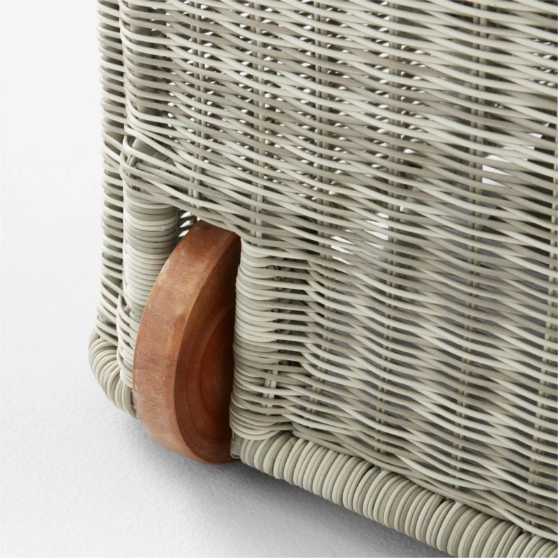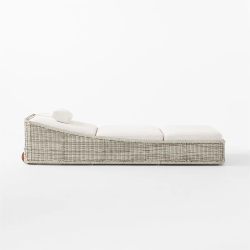 Ross Cassidy’s long, low outdoor chaise longue elevates the outdoor living experience. Inspired by the South of France, low-profile lounger has an aluminum frame that’s covered in woven variegated outdoor all-weather rattan in ivory. Plush cushions are covered in white terry boucle Sunbrella ® performance fabric, an unexpected choice that’s as comfortable as it is lavish. Adjust the back to one of its five positions or use the wooden wheels to reposition the chaise as the sun moves across the sky. CB2 exclusive.