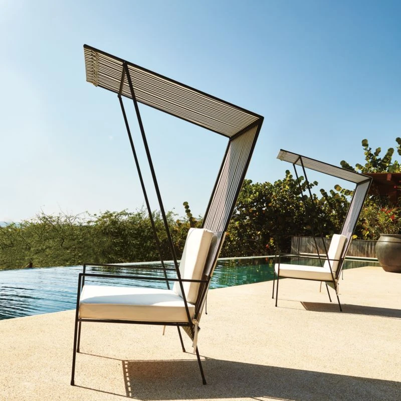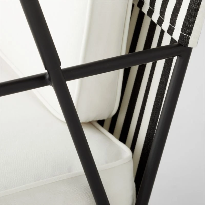 Part of Paul McCobb’s Pavilion Collection, cabana chair stays true to the effortlessly modern details of his original designs. Our reissue introduces bold stripes in a weather-resistant Sunbrella ® performance fabric, evoking the glamour of a vintage resort on the French Riviera. With a satin black iron frame, the vintage shaded silhouette makes a statement in modern outdoor spaces. Pair with the Pavilion Black Metal Outdoor Ottoman for the ultimate spot to lounge. CB2 exclusive.