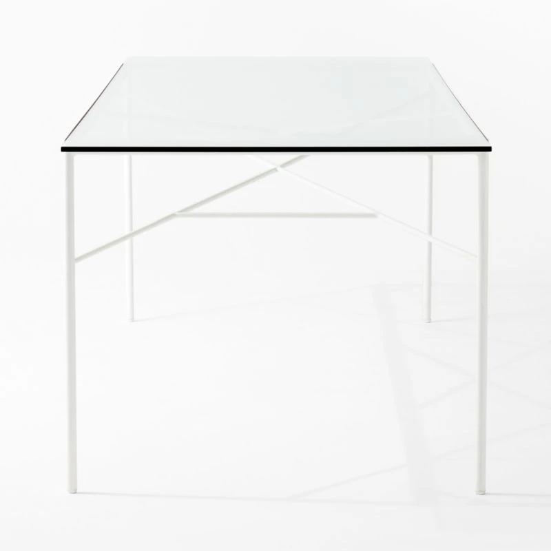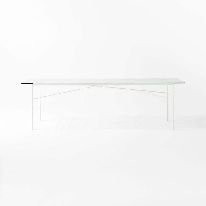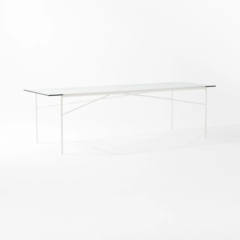First introduced as part of the Aerial Dining Group in Paul McCobb’s 1952 Pavilion Collection, this large dining table was designed to be durable, beautiful and easy to care for. The modern design of the table’s satin ivory iron frame can be seen through the tempered glass top. The Pavilion Collection was featured in the June 1953 issue of House & Garden magazine in an original McCobb illustration, yet doesn’t feel at all out of place in a modern outdoor space or even an indoor dining room. CB2 exclusive.