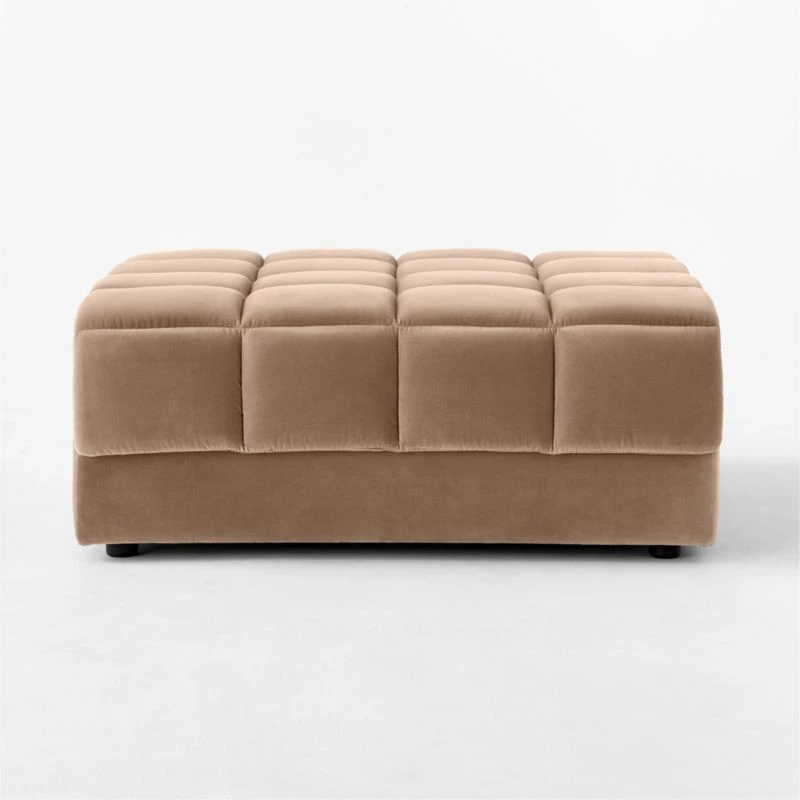 Designed in Barcelona by Mermelada Estudio, plush ottoman has a low profile designed for lounging. Deep, wide ’70s-influenced silhouette evokes the era of conversation pits, with clever construction details such as square tufting and lapped cushions that attach to the frame. Upholstered in a gorgeous beige velvet and crafted with solid birch certified sustainable by the Forest Stewardship Council ® (FSC), the ottoman is part of a modular collection that can be repositioned to suit a variety of seating needs. CB2 exclusive.