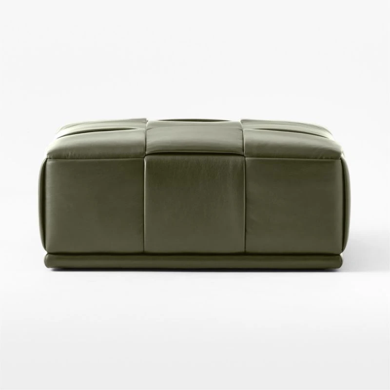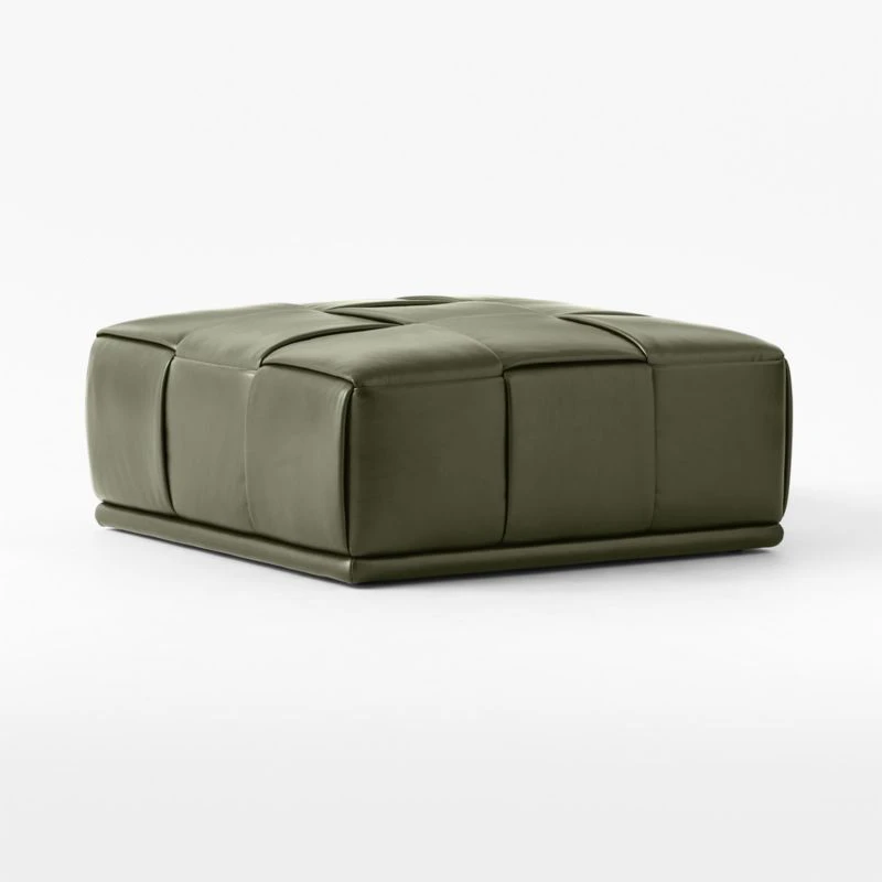 High-style ottoman by VUUE features wide swaths of rich green leather densely woven into a soft cube atop a plinth base. Sized to use as an ottoman, but also suitable as a plush coffee table. CB2 exclusive.