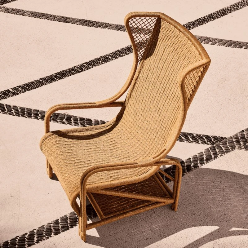 The Remo Suite evokes classic French designs and summers along the Riviera, spritz in hand. Dramatically scaled outdoor lounge chair by Ross Cassidy sees curves and angles intersect to create a distinctive silhouette that’s wrapped in all-weather rattan. The material is twisted and cross-woven around the frame to create a piece that looks like a magnificent vintage find, yet is crafted to last for seasons to come. Lower shelf keeps magazines, pool towels and other idle pleasures within easy reach. CB2 exclusive.
