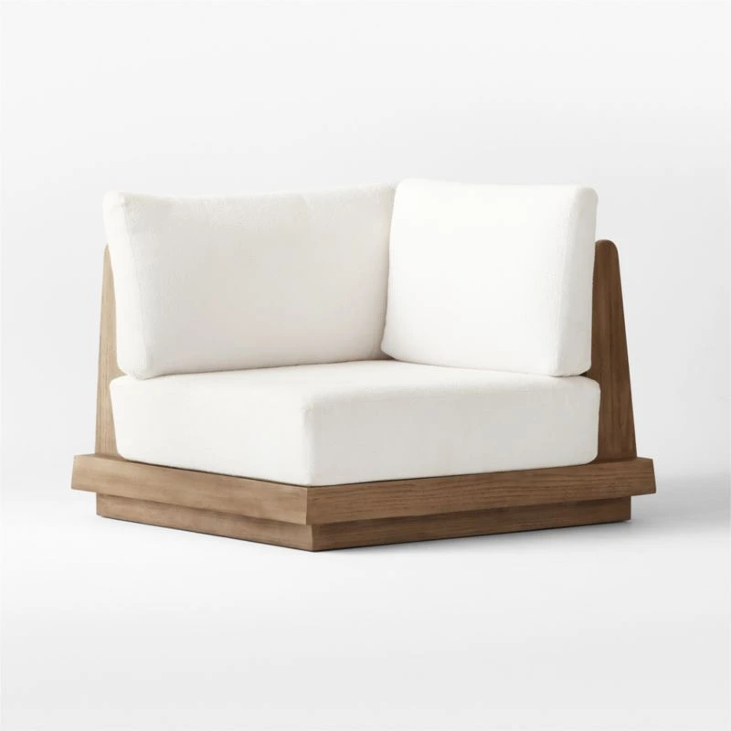 Generously proportioned, ultra comfy outdoor sectional by Jannis Ellenberger features an elevated mix of materials that turns ever-popular indoor boucle into an outdoor statement piece. Rich in natural oils, teak certified by the Forest Stewardship Council ® has an element of natural protection, making it an exceptional base for this chair. Plush, white Sunbrella ® boucle cushions play well with the teak, offering a nubby, textured feel that’s incredibly unique among outdoor fabrics. CB2 exclusive.
