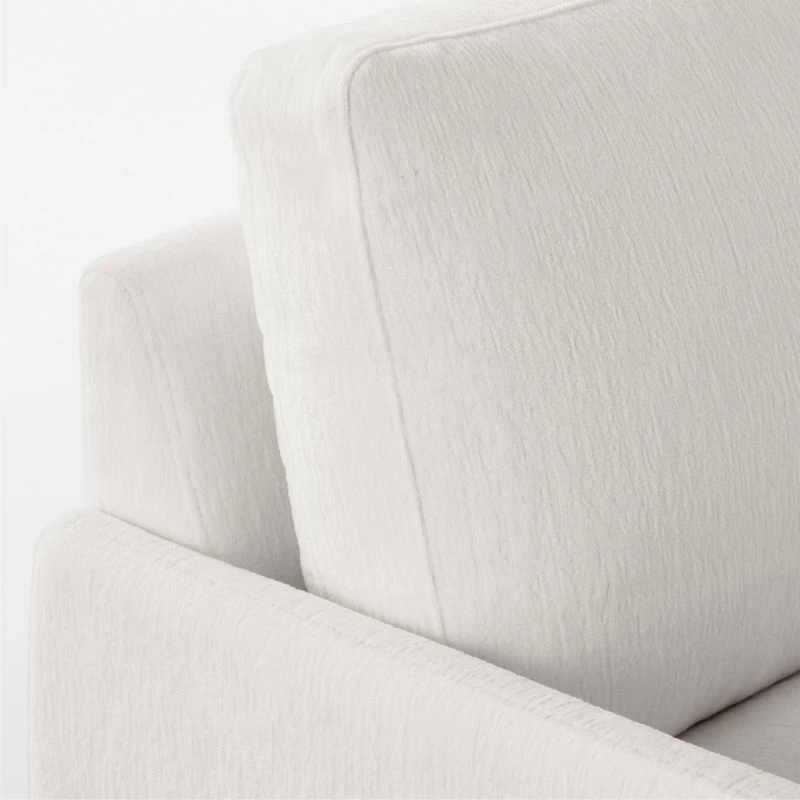 Chaise sectional sofa by Mermelada Estudio feels traditional at first, but upon closer inspection reveals modern sensibilities—like thin profile arms and a sleek silhouette. Tall, needlelike metal legs finished in a lustrous black powdercoat create graphic contrast with white upholstery. CB2 exclusive.