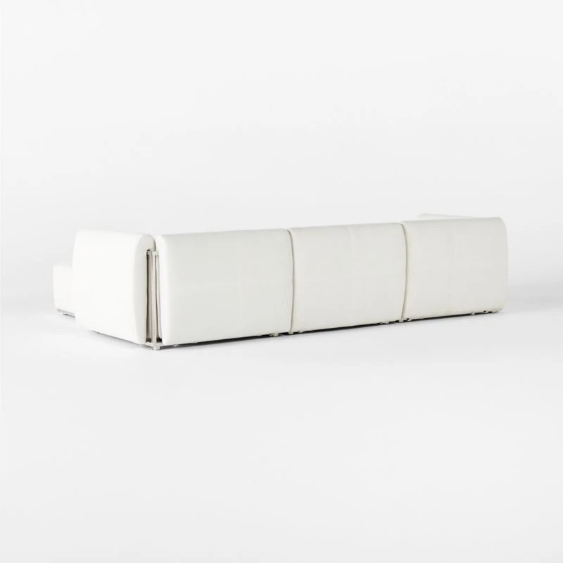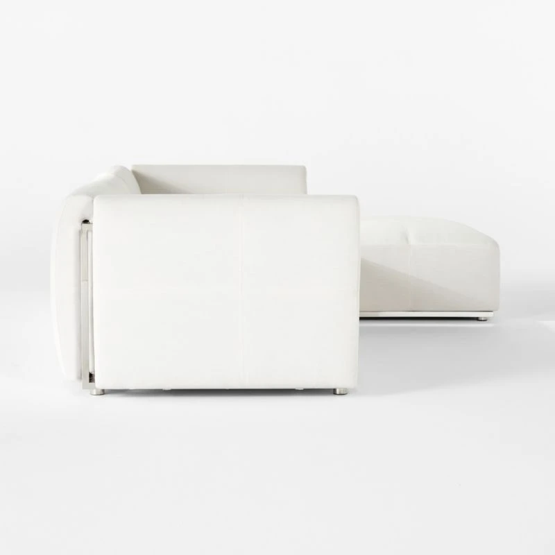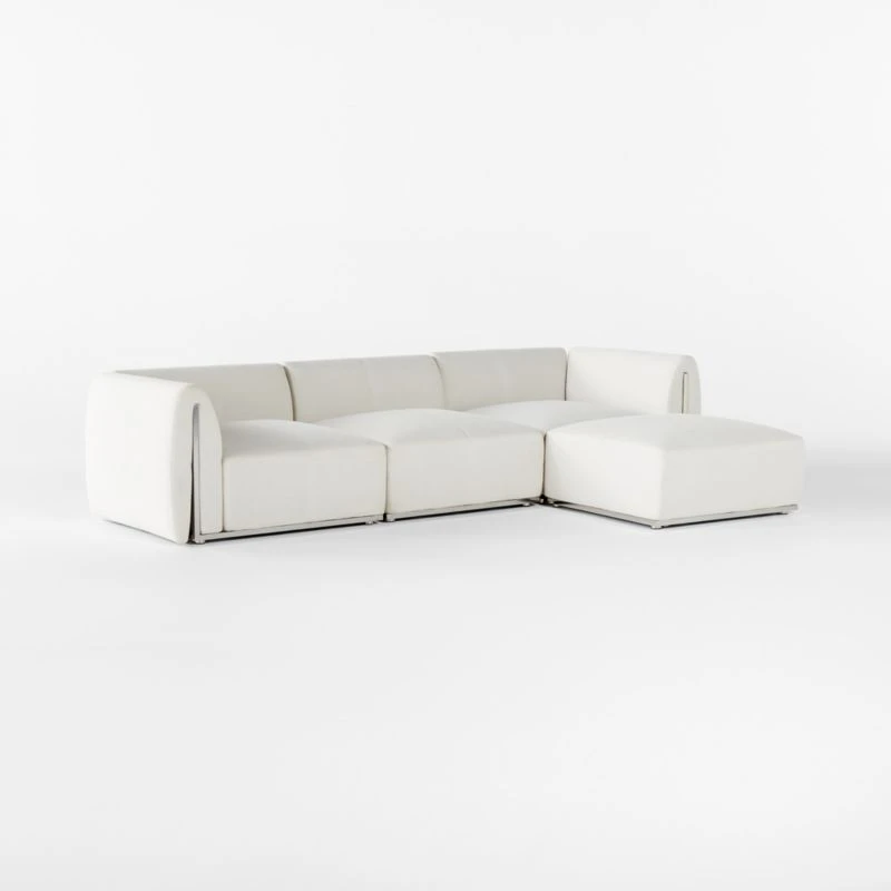 Drawing inspiration from vintage Italian modular sofas, sectional by Mermelada Estudio has the comfort and design details of indoor furniture but is constructed with outdoor-friendly materials. Plush, oversized quick-dry foam cushions feature Sunbrella ® performance fabric along with top-stitch detailing for added interest. Flashes of polished stainless steel gleam to create drama in the sunlight, moonlight and time in between. CB2 exclusive.