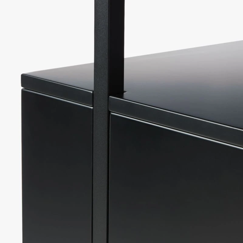 Minimalism scales to the max in a modern rise of black. Four shelves ladder sky high (a CB2 record eight feet) with a cabinet for closed storage down below. Powdercoated aluminum frame with hidden hardware accentuates neutral black construction. Mounts sturdy to the wall and pairs with the Stairway desk and bookcase. CB2 exclusive.