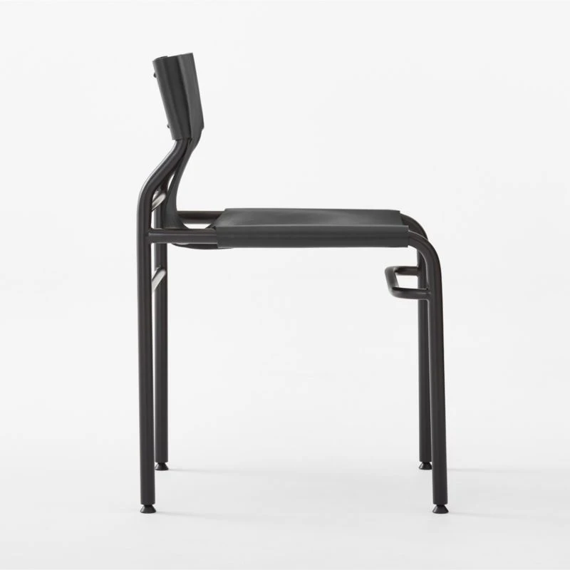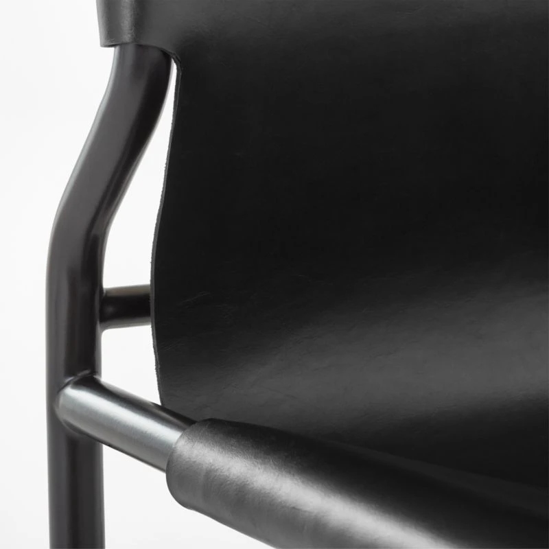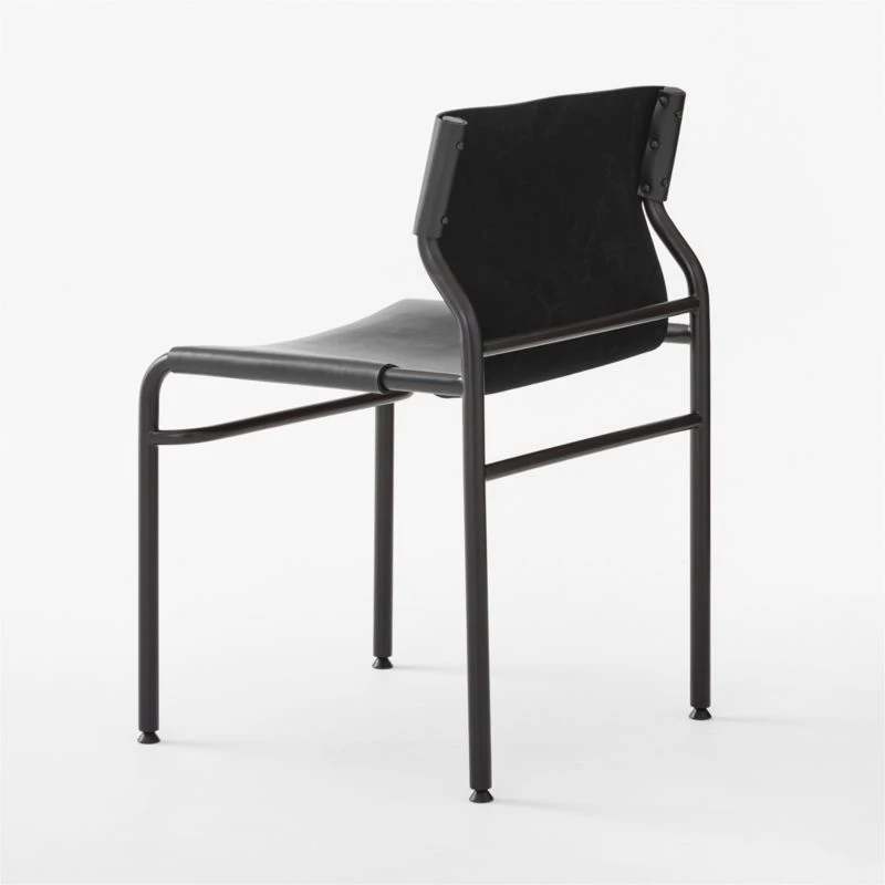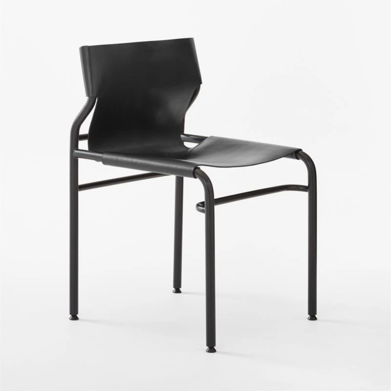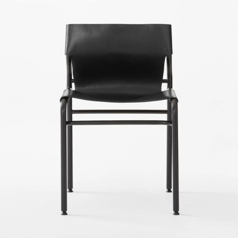 Genuine black leather drapes over the polished curves of this modern sling dining chair designed by VUUE. Stainless steel is cut to length, bent to desired shape and welded together to form the sleek silhouette. Leather is stretched across the frame and fixed with rivets. Leather will soften over time, but won’t sag. CB2 exclusive.