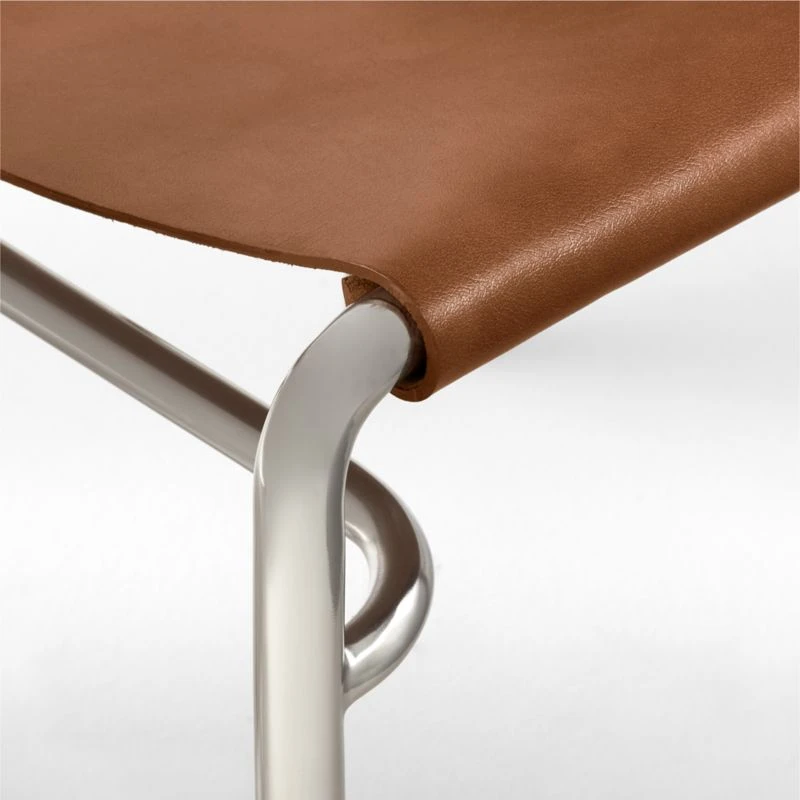 Genuine leather drapes over the polished curves of this modern sling dining chair designed by VUUE. Stainless steel is cut to length, bent to desired shape, and welded together to form the sleek silhouette. Leather is stretched across the frame and fixed with rivets. Leather will soften over time, but won’t sag. Learn more about VUUE on our blog. CB2 exclusive.