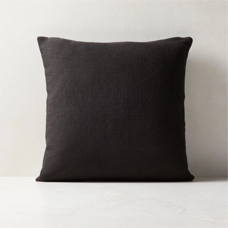 Thin strips of genuine black leather are cut and woven onto the front panel of this high-end throw pillow. Flips to a natural linen back with a metallic zipper on the seam. CB2 pillows include a pillow insert in your choice of feather down or down alternative. CB2 exclusive.
