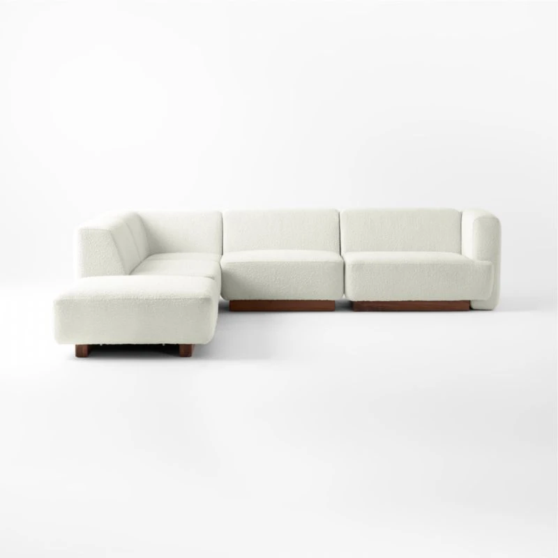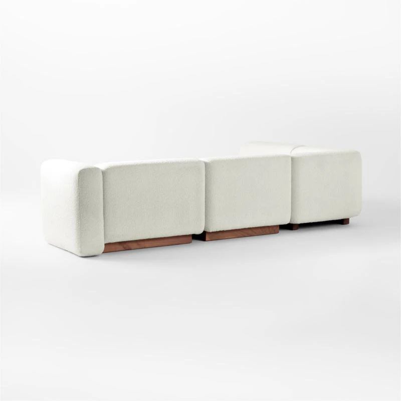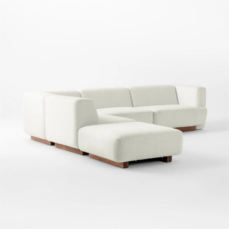 Designed by Lawson-Fenning, the Terrain furniture collection consists of modular pieces that can be arranged to create different environments. Sectional sofa features plush bouclé upholstery. Walnut base, certified sustainable by the Forest Stewardship Council ®, reveals warm tones and striations that vary from piece to piece. Includes right-armed chair, two armless chairs, corner chair and ottoman that come together as one. CB2 exclusive.