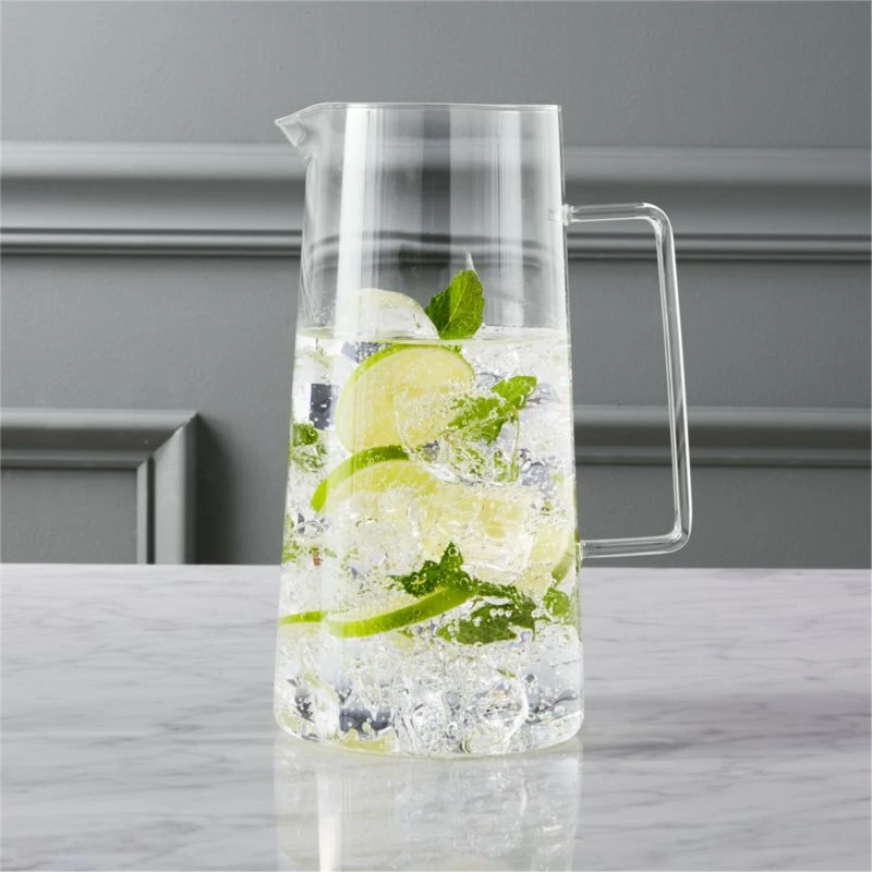 Handmade of ultra-durable beaker glass, this statuesque pitcher pours a party’s worth of cocktails, mocktails, iced tea or H2O. Slightly tapered shape is defined by elegant proportions and a modern square handle.