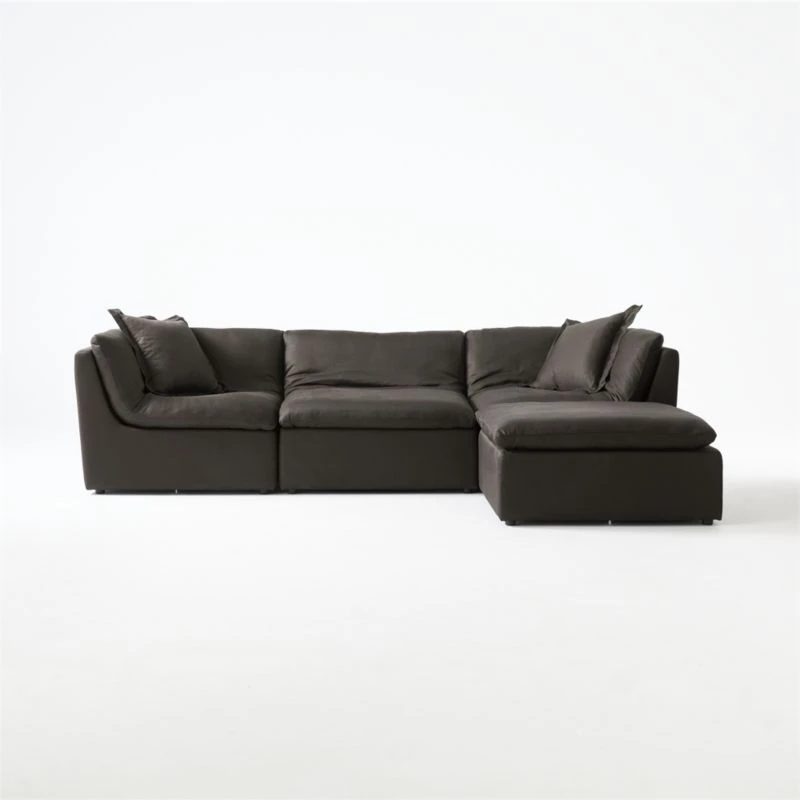 “I’m loving this sectional,” says designer Kara Mann. “It’s got this pillowed, effortless feel about it.” Thanks to plush feather down cushions covered in luxe black sateen with a slub texture that keeps it from feeling too fussy. Subtle curves make this sectional perfect for lounging. Arrange and rearrange the two corner chairs, one armless chair and ottoman to fit your changing needs. CB2 exclusive.