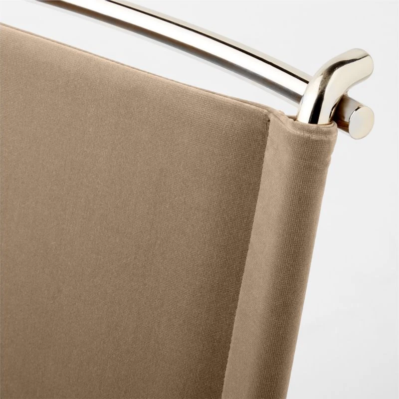 Armless, low-profile office chair by Mermelada Estudio has a French industrial feel. Polished stainless steel base and frame are complemented by artful casters with holes in the center for a stylish detail. Lush velvet upholstery in tan goes with everything. Also features adjustable seat and swivel.