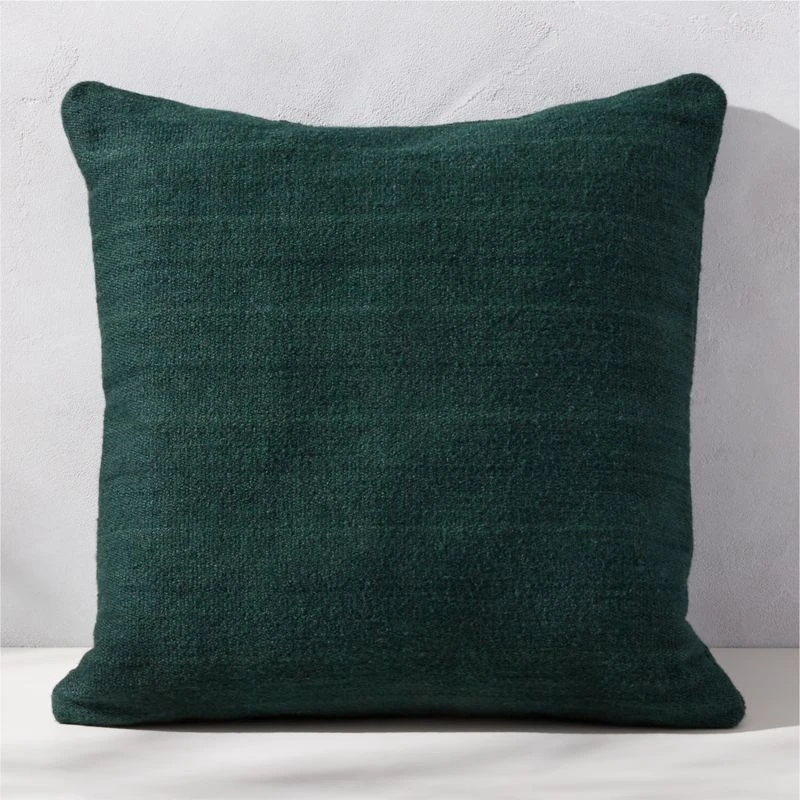 Dark green melange throw pillow brings the look and feel of traditional indoor textiles to the outdoors. Handwoven of recycled yarn on a traditional handloom, the thicker weave creates a beautiful melange effect, meaning no two pillows will be exactly alike. CB2 exclusive.